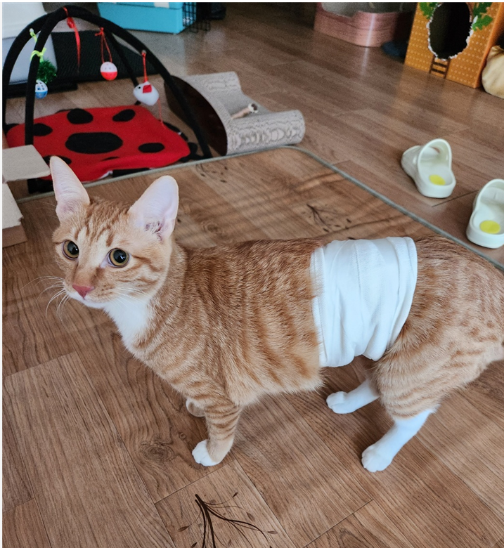 - 수술 부위 핥지 않도록 넥카라 착용 : 저희 고양이는 사진에서처럼 넥카라 착용을 싫어했지만 필수!!!!